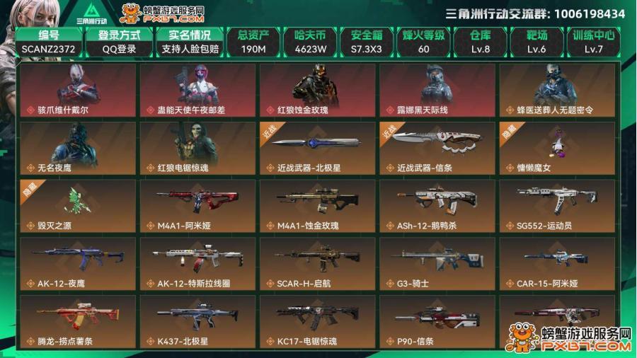 【SCANZ6272】总资产:470M,哈夫币:275W,武器皮肤:1,烽火60级:三角洲巅峰,列兵,【安全箱】S7顶级安全箱;【特勤处等级】仓库LV.7,靶场